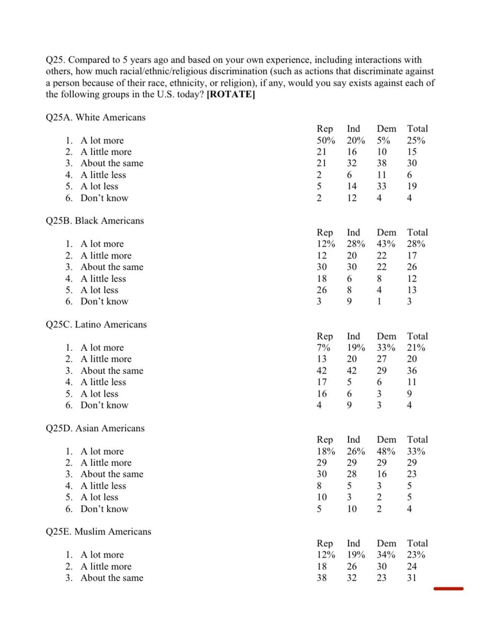 Кроме того, 28,9% белых респондентов отмечают значительный рост случаев дискриминации против населения США азиатского происхождения, 21,7% - против еврейского, 20,4% - против афроамериканцев, 19,7% - против мусульман и 14,7% - против латиноамериканцев.