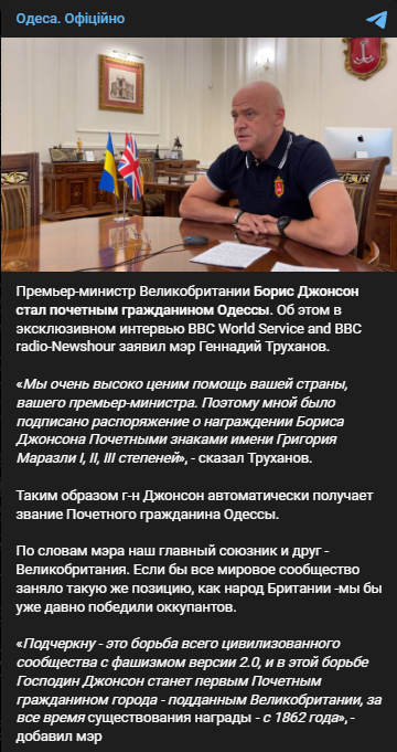 Труханов заявил, что британского премьера наградили почетными знаками имени Григория Маразли І, ІІ, ІІІ степеней. Таким образом, Джонсон автоматически получает звание почетного гражданина Одессы.