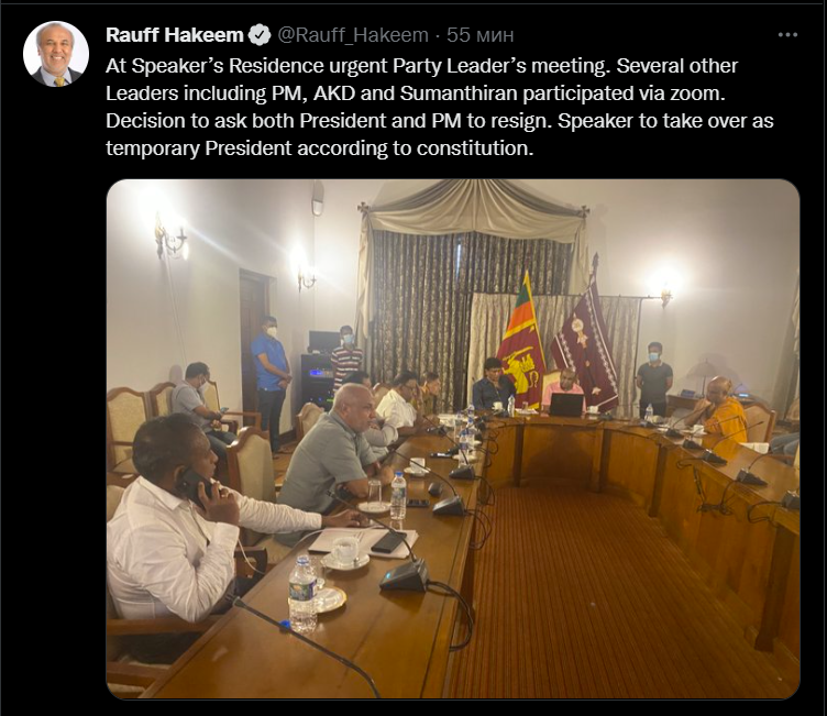 "В резиденции спикера срочное собрание лидеров партии. Несколько других лидеров, в том числе премьер-министр (Ранил Викрамасингхе) … приняли участие через Zoom. Решили просить президента и премьер-министра уйти в отставку. Спикер становится временным президентом в соответствии с конституцией. Лидеры партий должны немедленно согласовать всепартийное правительство", — написал Хаким в Twitter.