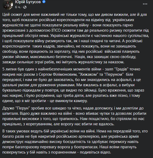 Место событий не указано. Но ранее Бутусов сообщал, что находится на севере Донбасса.