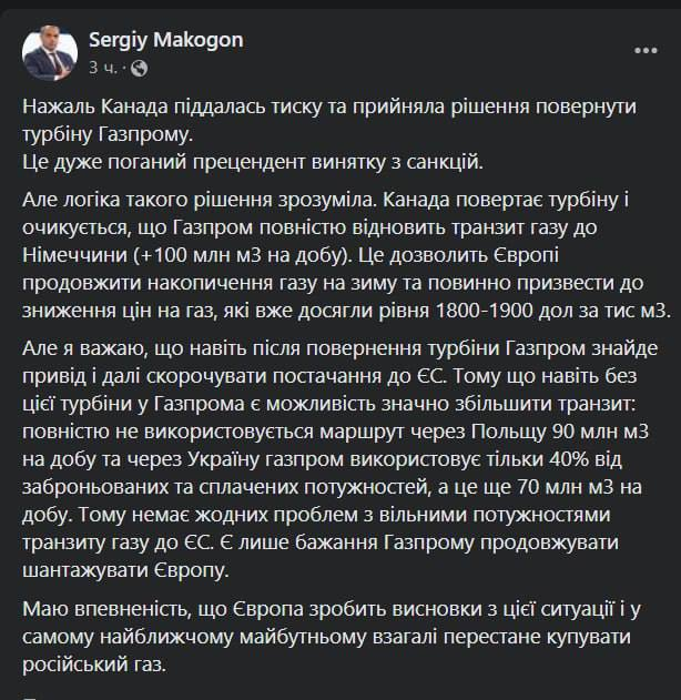 Макогон отреагировал на передачу Канадой турбины для работы "Северного потока". Фото: slovoidilo.ua