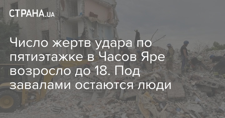 Число погибших из-за удара по пятиэтажке в Часов Яре в Донецкой области возросла до 18 человек. Спасти удалось шестерых. Еще 22 человека, в том числе и ребенок, могут находиться под завалами.