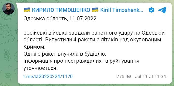 Утром в понедельник, 11 июля, россияне выпустили по Одесской области четыре ракеты. В результате есть попадание в здание.