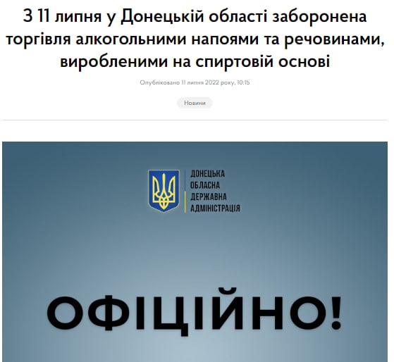 "В целях обеспечения общественной безопасности и порядка с 11 июля 2022 года на территории Донецкой области на период действия правового режима военного состояния запрещена торговля алкогольными напитками и веществами, произведенными на спиртовой основе (за исключением лекарственных средств)", - говорится в сообщении.