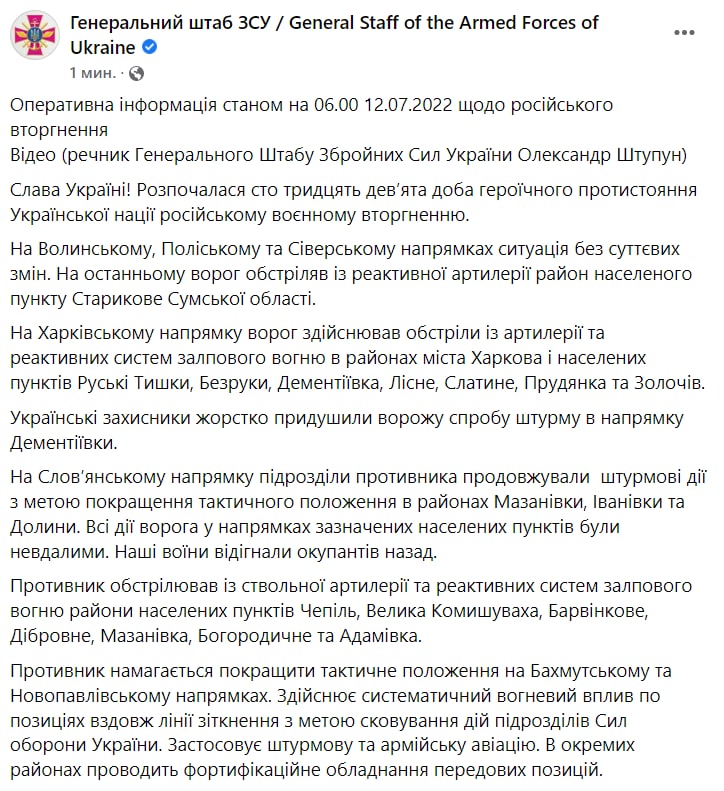 08:05 Сводка украинского Генштаба на утро 12 июля.
