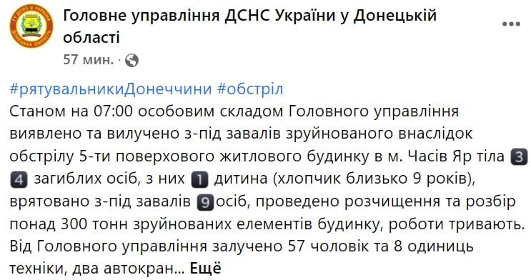 20.37 До 45 увеличилось число погибших в результате субботнего удара по пятиэтажке в Часовом Яру Донецкой области.