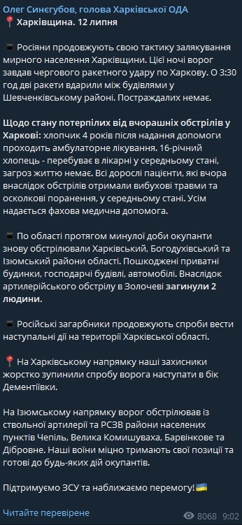 "Утром, 12 июля, Николаев подвергся массированному ракетному обстрелу. Предварительно известно о попадании в два медицинских учреждения и жилых дома. В результате обстрелов 4 человека ранены, предварительно без жертв".