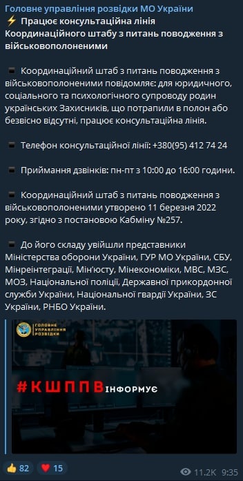 09:50 Заработала консультационная линия штаба по вопросам украинских военнопленных.