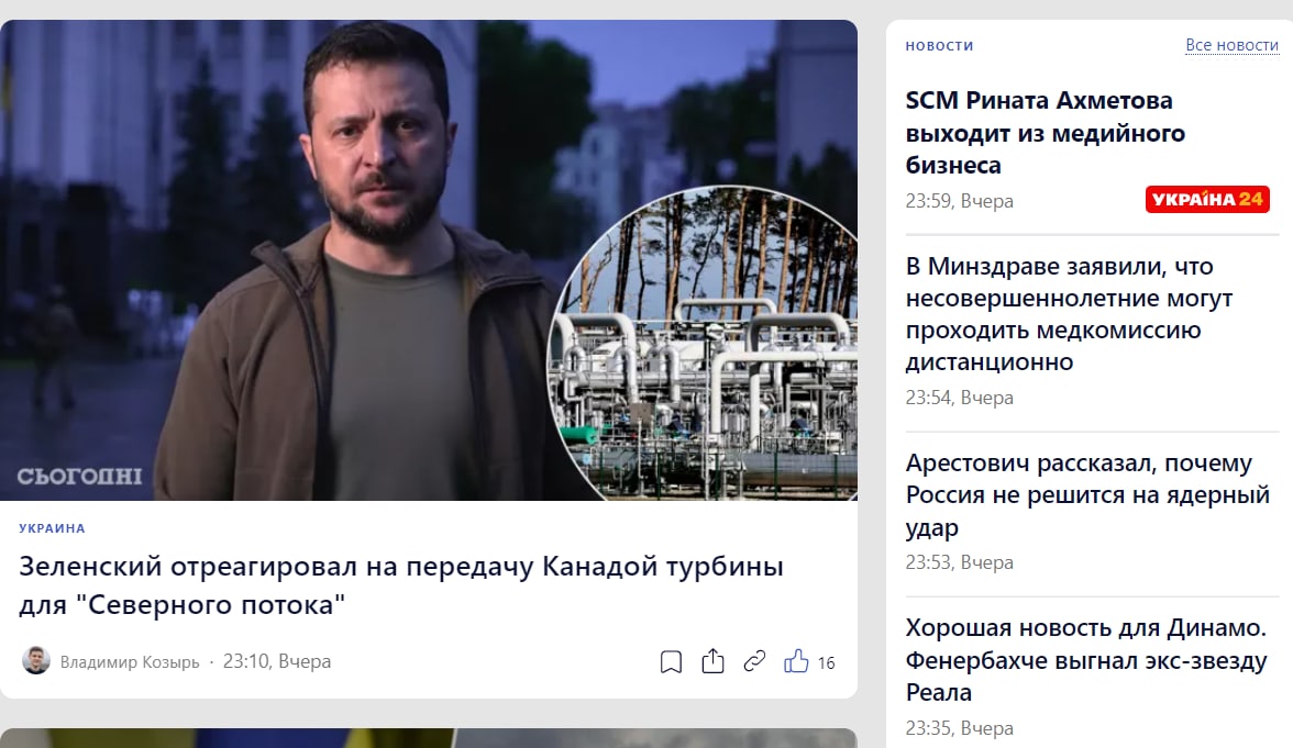 Сайты "Сегодня" и "Украина 24" перестали обновляться. Последняя новость на сайте "Сегодня" вышла вчера в 23:59.