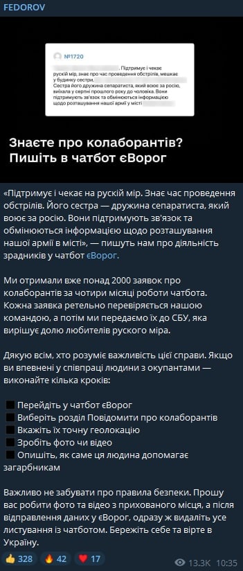 За 4 месяца работы Минцифры получило через чатбот более 2000 "заявок о коллаборантах". Все они переданы в СБУ.