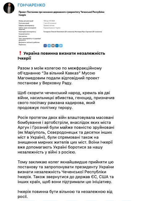 "Чтобы покорить чеченский народ, кремль вел две войны, насильственные убийства, геноцид, назначил своего муртада рамзана кадырова, который продолжает политику террора. Поэтому призываю коллег поскорее принять это постановление и предложить президенту Украины признать независимость Чеченской Республики Ичкерия. Также обратиться в государства ЕС, США и другие страны, чтобы они поддержали эту инициативу", - написал Гончаренко.
