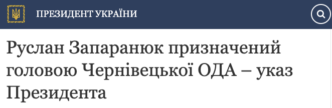 Президент Владимир Зеленский подписал указ о назначении Руслана Запаранюка главой Черновицкой облгосадминистрации. Это решение было согласовано несколько дней назад.