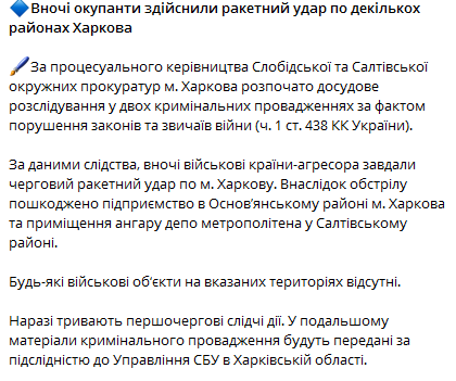 В Харьковской областной прокуратуре уточняют, что из-за ночного обстрела повреждено предприятие в Основянском районе Харькова и помещение ангара депо метрополитена в Салтовском районе.
