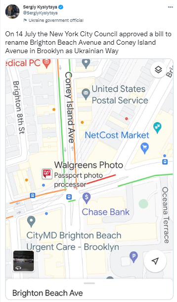 "14 июля городской совет Нью-Йорка одобрил законопроект о переименовании Брайтон-Бич-Авеню и Кони-Айленд-авеню в Бруклине в Украинский путь", - написал он.