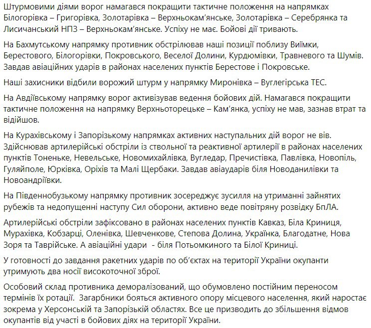 Там же войска РФ безуспешно пытались наступать на направлениях Белогоровка – Григорьевка, Золотаревка – Верхнекаменское, Золотаревка – Серебрянка и Лисичанский НПЗ – Верхнекаменское. Боевые действия продолжаются.