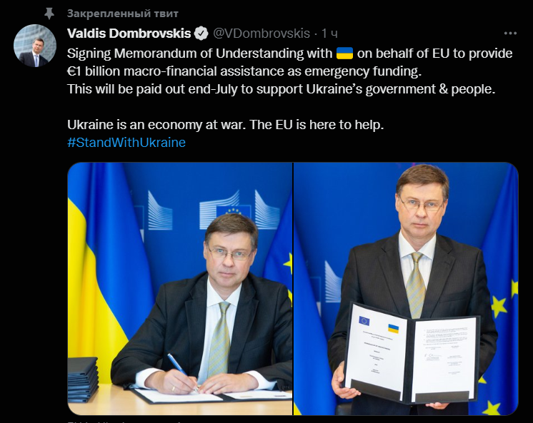 Речь идет о первом транше в рамках общей суммы макрофинансовой помощи в размере 9 млрд евро, который Совет Европы одобрил по итогам саммита 24 июня.