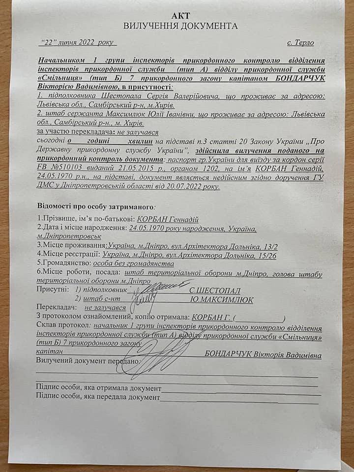 У меня изъяли паспорт гражданина Украины, выдали акт. Домой в Украину меня не пускают. В Днепр, где живут мои больные родители, в город и страну, которую я люблю и защищаю с 2014 года и руковожу Штабом Территориальной обороны с 24 февраля 2022 года.