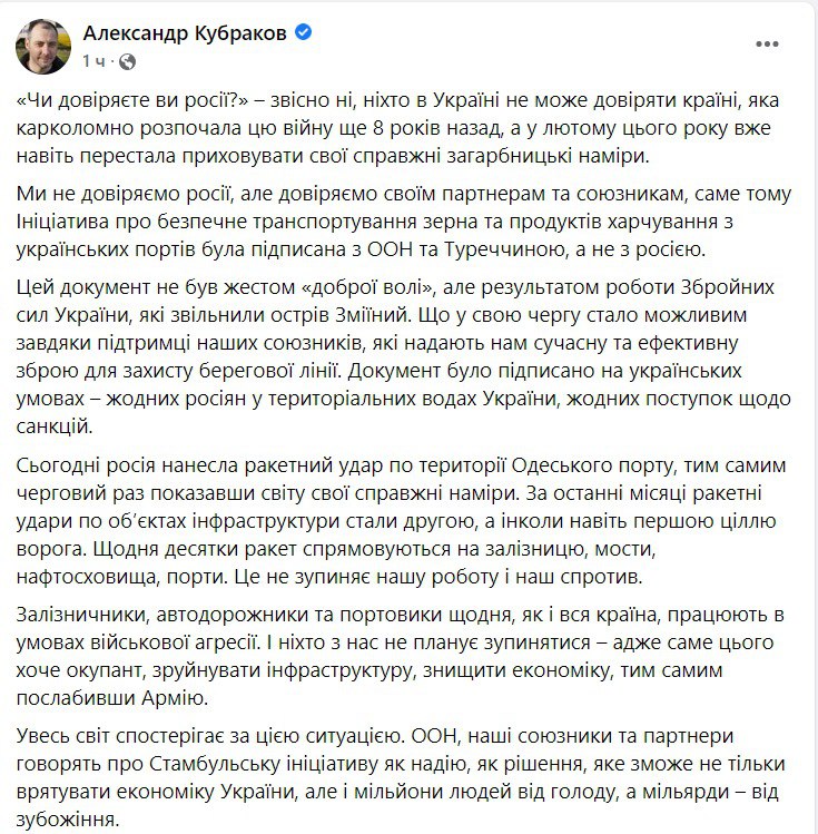 Именно поэтому украинская сторона подписывала соглашение о безопасной транспортировке зерна и продуктов питания с ООН и Турцией, а не непосредственно с Россией, объяснил министр.