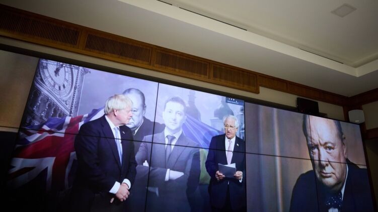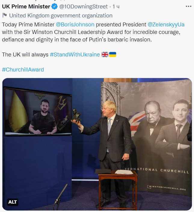 "Сегодня премьер-министр Джонсон вручил президенту Зеленскому премию сэра Уинстона Черчилля за лидерство, за невероятное мужество, неповиновение и достоинство перед лицом варварского вторжения Путина", – говорится в сообщении.