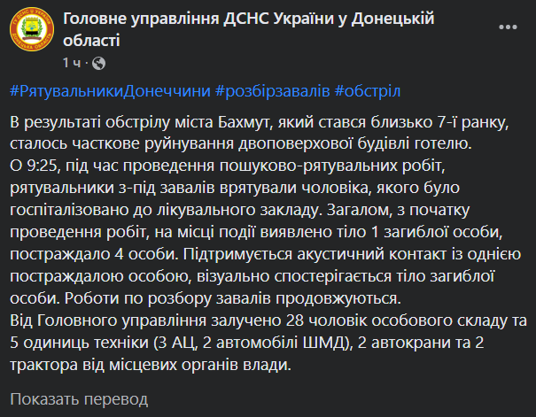 Утром в среду, 27 июля, россияне обстреляли Бахмут Донецкой области. В результате произошло частичное разрушение двухэтажного здания гостиницы. Под завалами оказались люди.