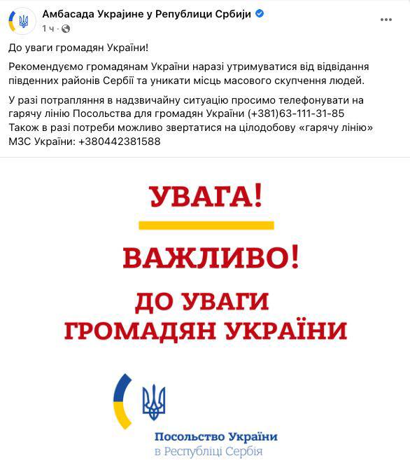 Граждан Украины призывают также избегать мест массового скопления людей, а при попадании в чрезвычайную ситуацию звонить на горячую линию посольства по телефону +381631113185 либо на круглосуточную "горячую линию" МИД Украины: +380442381588.
