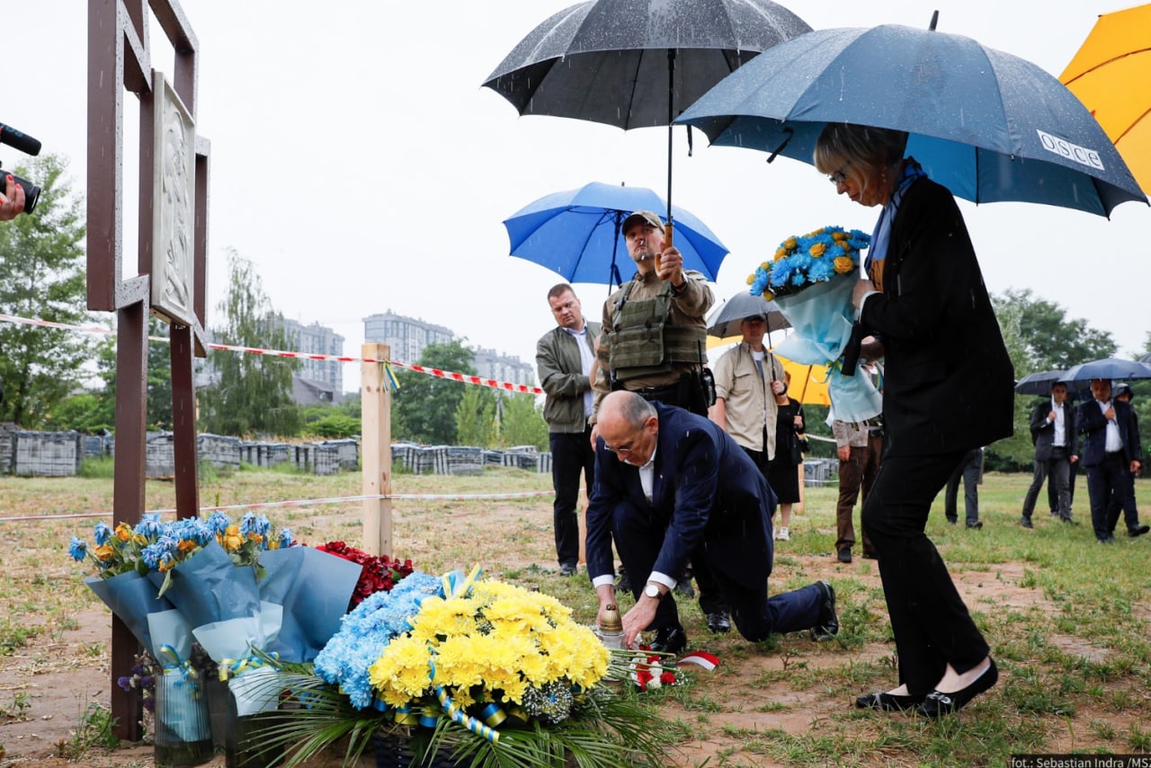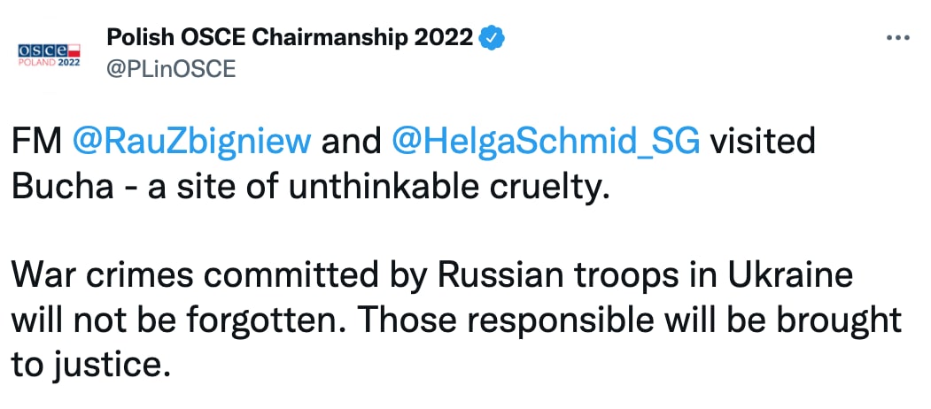 В Украину прибыл министр иностранных дел Польши, действующий председатель ОБСЕ Збигнев Рау. Вместе с ним приехала генеральный секретарь ОБСЕ Хельга Мария Шмид. Под проливным дождем делегация посетила Бучу, где нашли свыше 416 тел погибших во время войны.