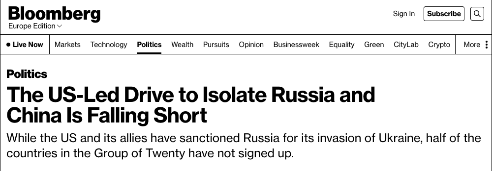 Половина стран "Большой двадцатки" не ввели санкции против России за вторжение в Украину и не поддерживают стремление Запада изолировать РФ.