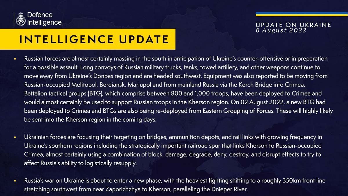 Так, 2 августа в Крым была переброшена новая БТГ, также идет передислокация БТГ восточной группировки войск. Скорее всего, в ближайшие дни они будут отправлены в Херсонскую область, прогнозирует разведка.
