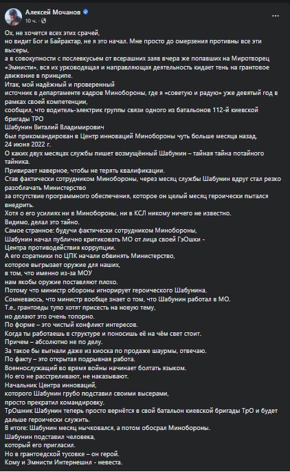 "Сомневаюсь, что министр вообще знает о том, что Шабунин работал в МО. Т.е., грантоеды тупо хотят присесть на новую тему, но делают это очень топорно. По форме – это чистый конфликт интересов. Когда ты работаешь в структуре и поносишь её на чём свет стоит. Причем – абсолютно не по делу. За такое бы выгнали даже из киоска по продаже шаурмы", - пишет Мочанов, называя деятельность Шабунина "открытой подрывной работой".