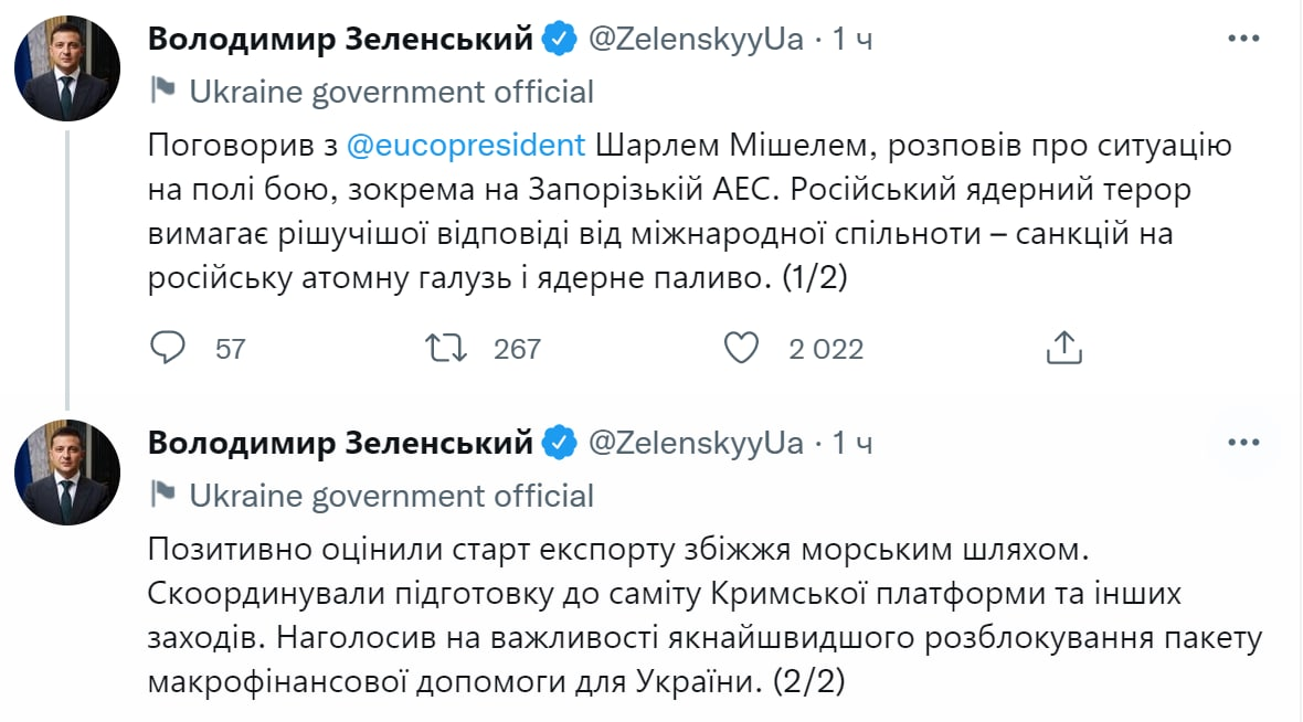 "Поговорили с президентом Евросовета Шарлем Мишелем. Рассказал ему об обстановке на поле боя, в частности на Запорожской АЭС. Российский ядерный террор требует более решительного ответа со стороны международного сообщества – санкций в отношении российской атомной отрасли и ядерного топлива", - написал Зеленский в Твиттере в воскресенье.