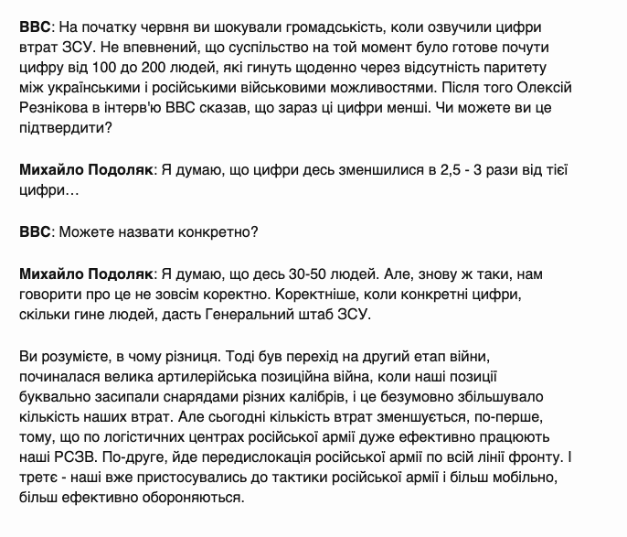 "Я думаю, что цифры где-то уменьшились в 2,5 - 3 раза от той цифры... (озвученной Подоляком в июне - Ред.) Я думаю, что где-то 30-50 человек. Но, опять же, нам говорить об этом не совсем корректно", - заявил Подоляк.