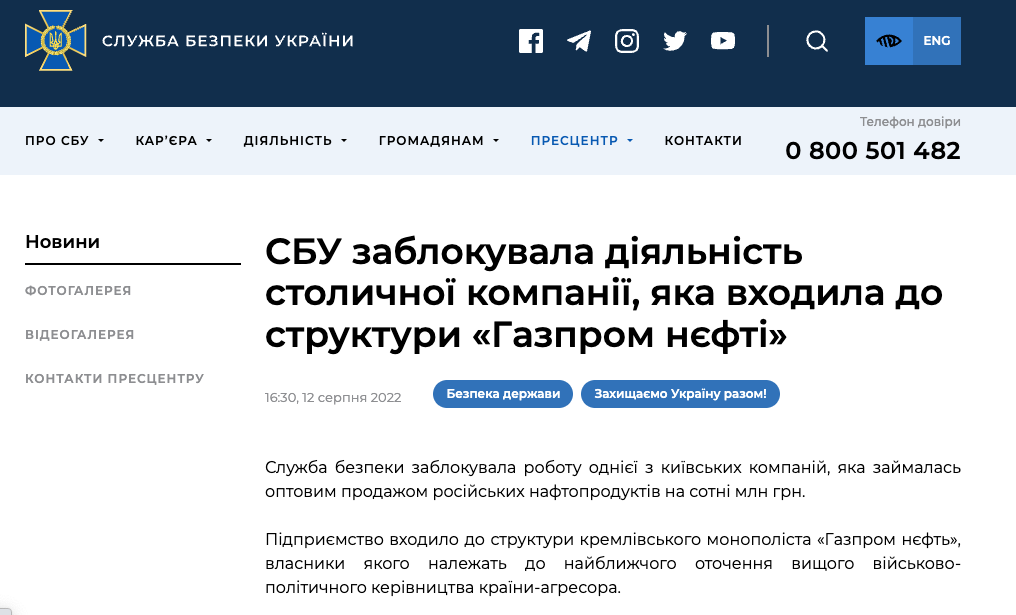 СБУ заявляет, что заблокировала деятельность киевской компании из структуры "Газпром нефти", которая занималась оптовой продажей российских нефтепродуктов.
