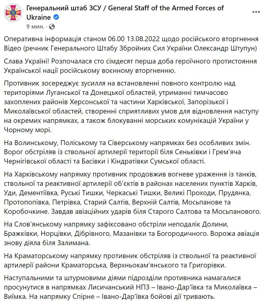 Генштаб Вооруженных сил Украины в своем Facebook опубликовал утреннюю сводку на субботу, 13 августа. Главное из сводки: