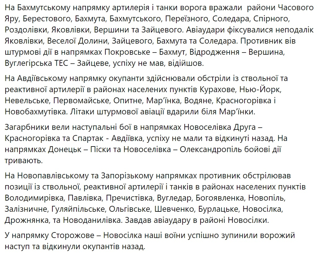 Также "Страна" сообщала, что, по данным Генштаба, ВСУ остановили штурм россиян на Авдеевском направлении. Противник нанес авиаудары неподалеку от Красногоровки, Марьинки, Водяного и Авдеевка. Все вражеские попытки штурма в районах Спартака, Песков и Марьинки наши защитники подавили и отбросили оккупантов на прежние позиции. В то же время в направлении Покровское – Бахмут враг имел частичный успех, пытается закрепиться.