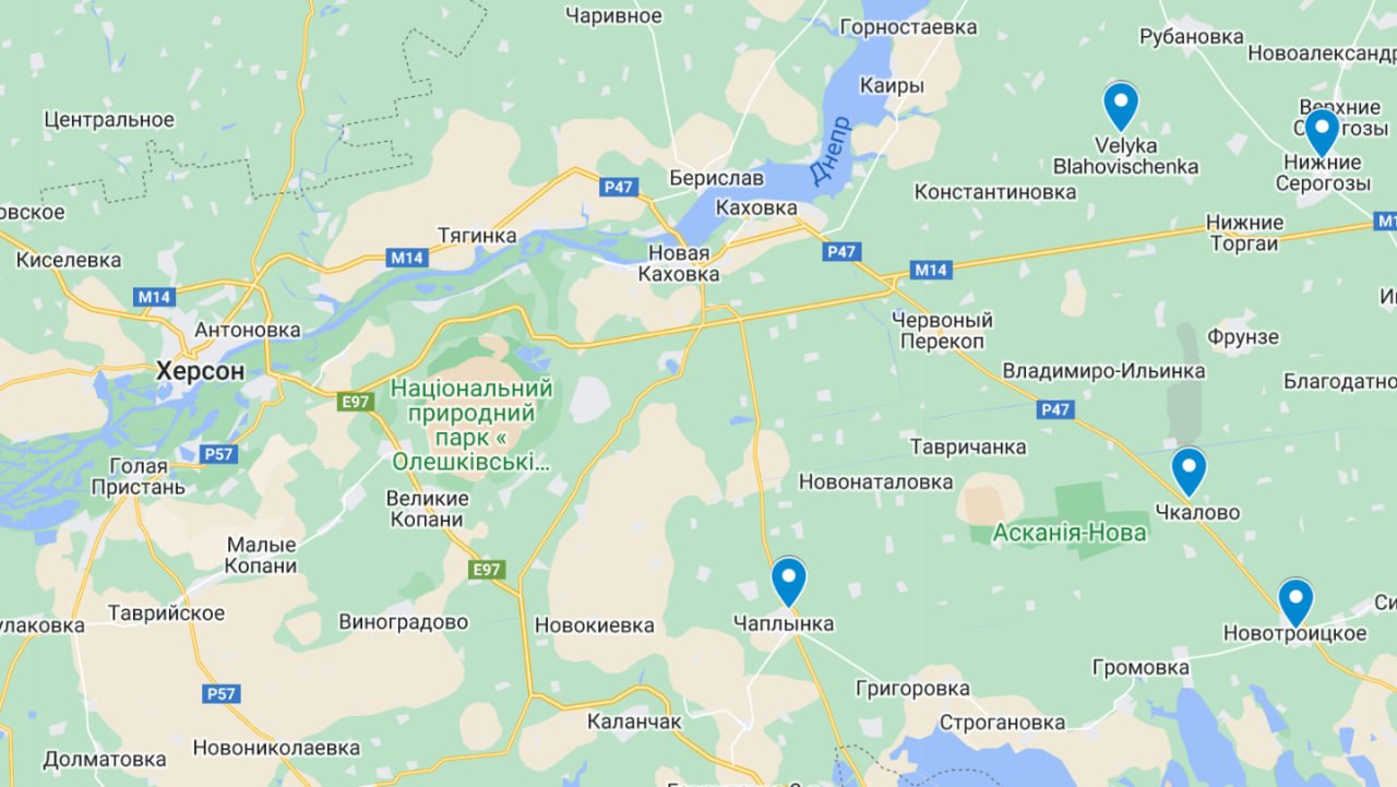 Херсонские паблики пишут, что взрывы слышны сразу в нескольких местах области: Чкалове, Новотроицком и Нижних Серогозах. В Великой Благовещенке и Чаплинке сильные взрывы. Все эти населенные пункты расположены на восток от Херсона.