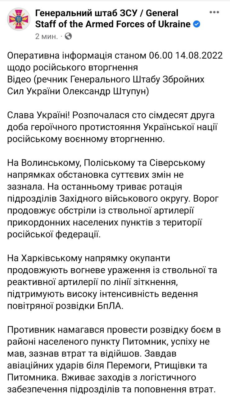 Тем временем война в Украине продолжается уже 172-й день. "Страна" следит за происходящим 14 августа в обновляемом материале.