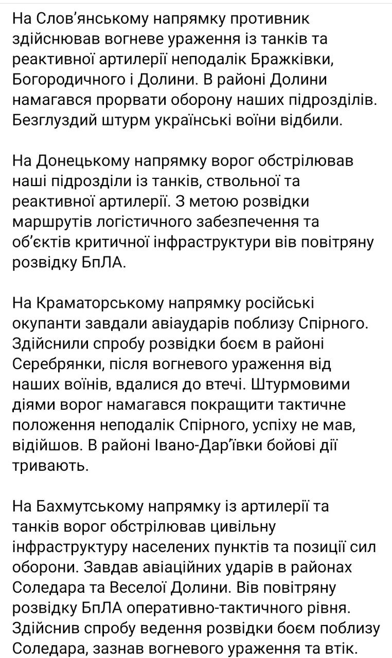 • На Краматорском направлении российские оккупанты нанесли авиаудары близ Спирного. Совершили попытку разведки боем в районе Серебрянки, после огневого поражения от наших воинов, прибегли к бегству. Штурмовыми действиями враг пытался улучшить тактическое положение недалеко от Спорного, успеха не имел, отошел. В районе Ивано-Дарьевки боевые действия продолжаются.