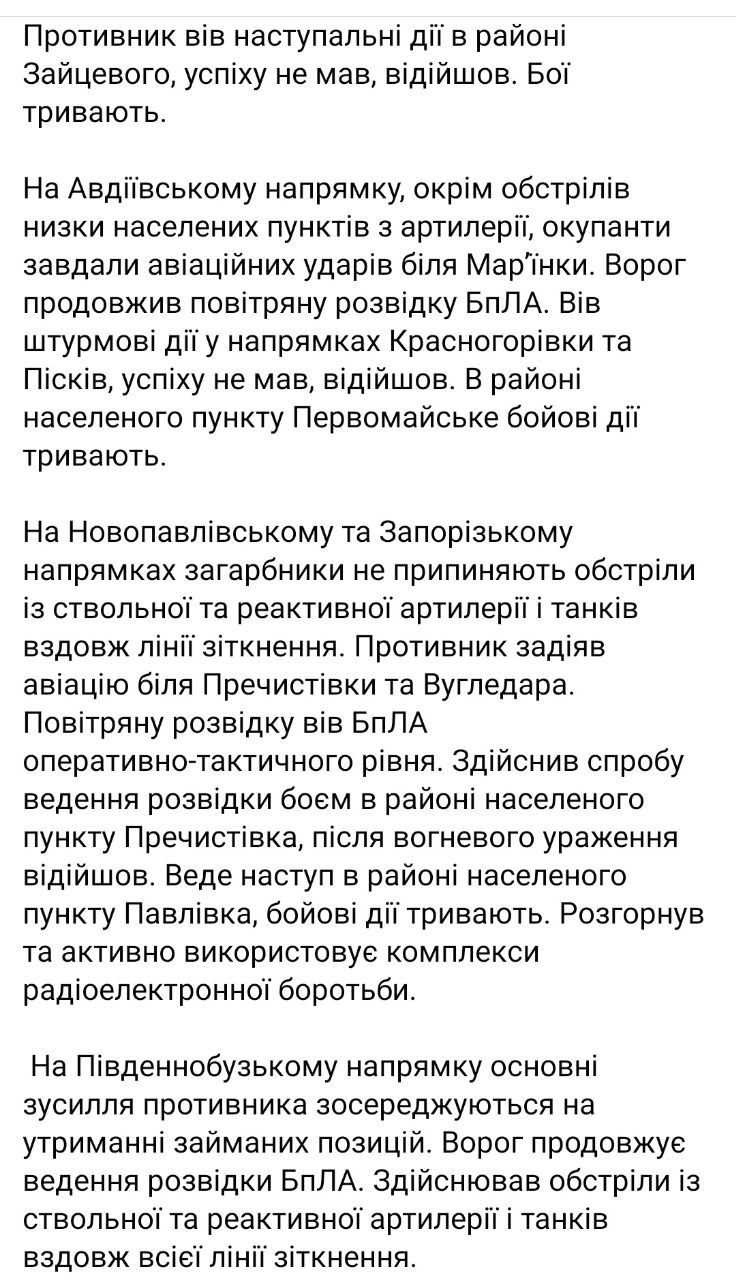 • В Новопавловском и Запорожском направлениях захватчики не прекращают обстрелы из ствольной и реактивной артиллерии и танков вдоль линии столкновения. Противник задействовал авиацию возле Пречистовки и Угледара. Воздушную разведку вел БПЛА оперативно-тактического уровня. Совершил попытку ведения разведки боем в районе населенного пункта Пречистовка, после огневого поражения отошел. Ведет наступление в районе населенного пункта Павловка, боевые действия продолжаются. Развернул и активно использует комплексы радиоэлектронной борьбы.