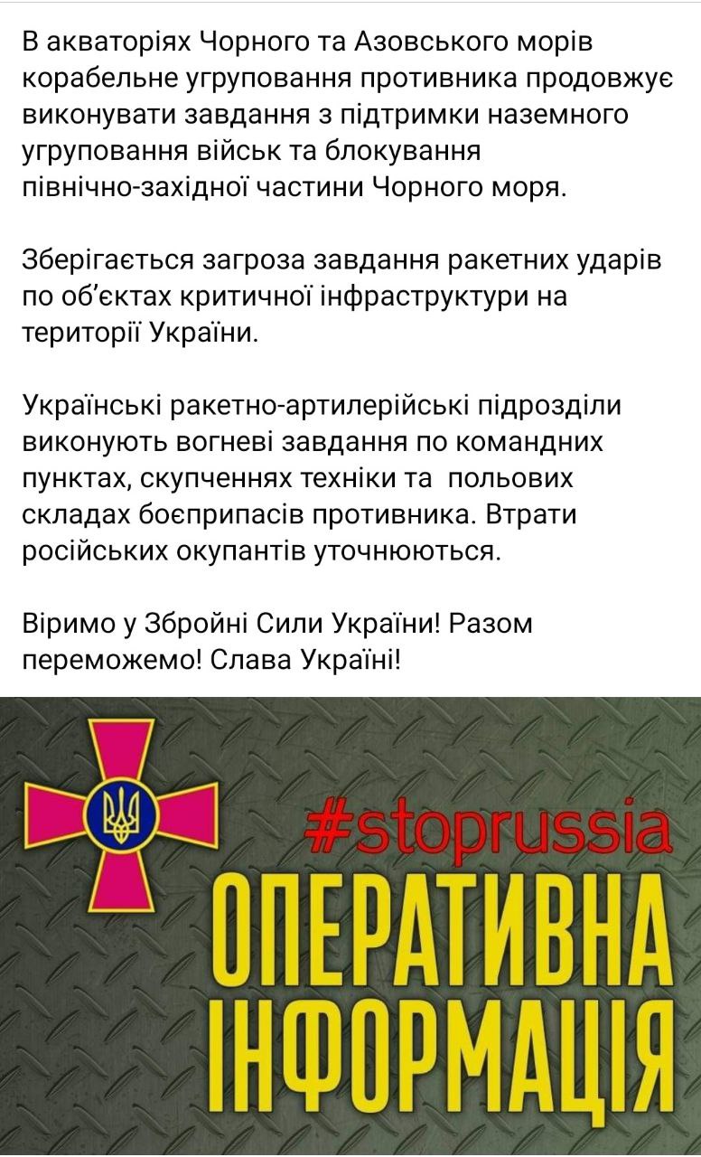 • В акваториях Черного и Азовского морей корабельная группировка противника продолжает выполнять задачи поддержки наземной группировки войск и блокирования северо-западной части Черного моря.