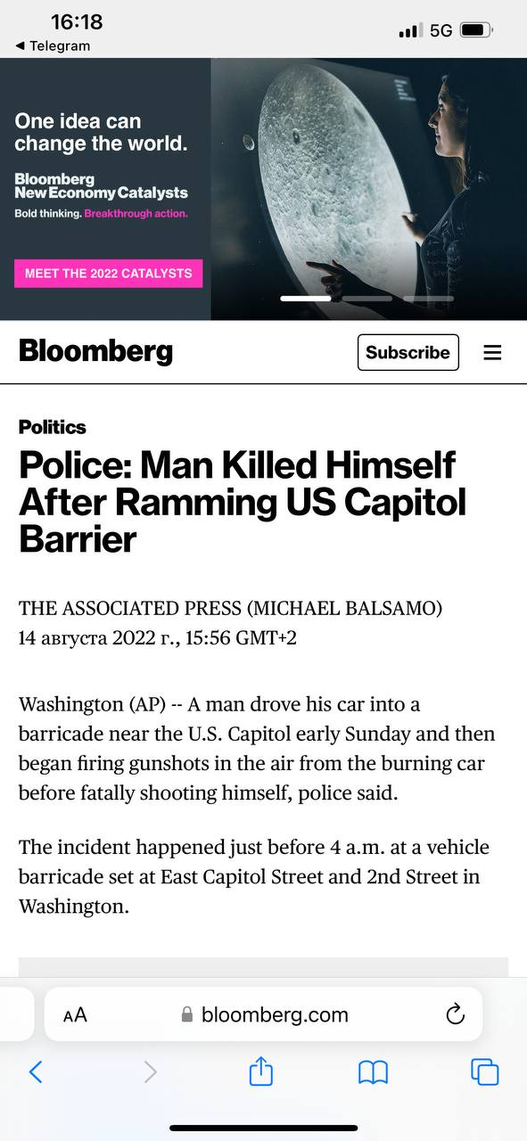 Аналогичную версию событий обнародовал Bloomberg. По словам вашингтонского корреспондента агентства, злоумышленник врезался в служебные автомобили, блокировавшие угол Ист-Кэпитол-стрит и 2-й улицы.