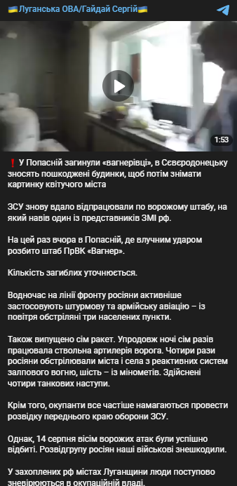 Глава Луганской ОГА Сергей Гайдай подтвердил удар по базе "вагнеровцев" в Попасной.