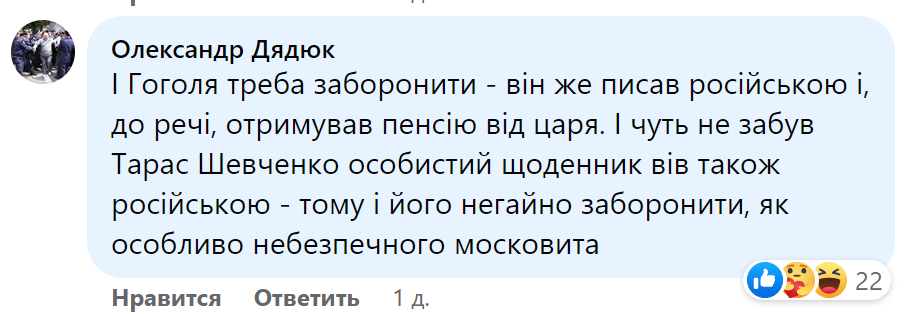 "И Гоголя надо запретить – он же писал на русском и, кстати, получал пенсию от царя. И, чуть не забыл, Тарас Шевченко личный дневник вел также по-русски - потому и его немедленно запретить, как особо опасного московита", - написал киевский активист Александр Дядюк.