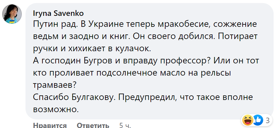 "Путин рад. В Украине теперь мракобесие, сожжение ведьм и заодно и книг. Он своего добился. Потирает ручки и хихикает в кулачок.