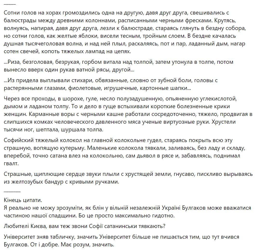 Она сначала написала благодарственный пост ректору КНУ Владимиру Бугрову. А потом добавила свое развернутое мнение, почему Булгакову не место в Киеве. Как пример она привела отрывок из "Белой гвардии", где изображается въезд Директории в Киев.