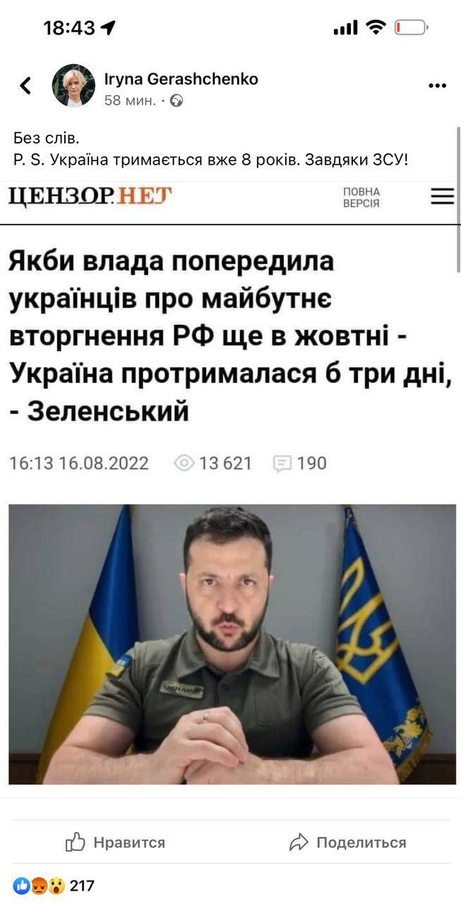 Геращенко подписала пост так: "Без слов. P.S. Украина держится уже 8 лет. Благодаря ВСУ".