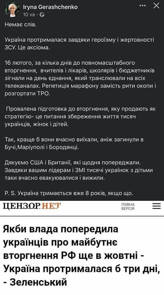 В этот раз Безуглая пришла в комментарии под пост нардепа от "Европейской Солидарности" Ирины Геращенко, где та опубликовала фото новости, в которой президент Владимира Зеленский объясняет, почему власти не предупредили украинцев о предстоящем вторжении России.