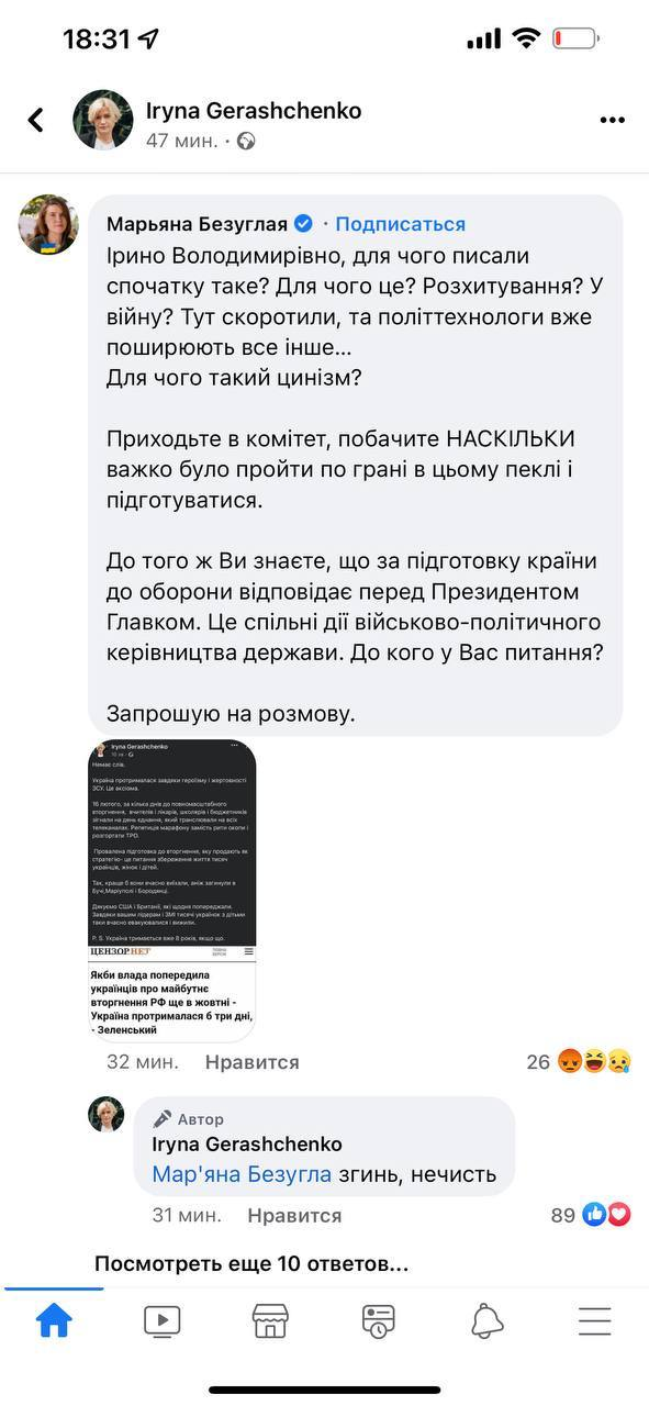 На что Безуглая в комментариях под постом опубликовала скрин первоначальной версии поста Геращенко (где она в более жёсткой форме "наехала" на президента), и спросила "Для чего это? Раскачивание? Во время войны?", а также пригласила Геращенко на разговор.