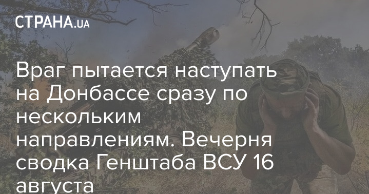Генштаб ВСУ опубликовал оперативную информацию о российском вторжении по состоянию на 18:00 16 августа. По его данным, противник пытается наступать по нескольким направлениям на Донбассе.