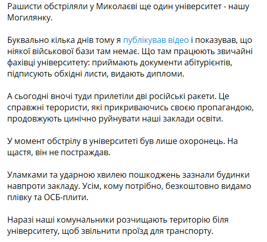 В Николаеве войска РФ ночью обстреляли здание Черноморского национального университета им. Петра Могилы. Туда прилетели две ракеты.