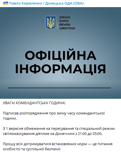 С 1 сентября комендантский час будет действовать в Донецкой области с 21:00 до 05:00. Об этом сообщил губернатор Павел Кириленко в своем телеграм-канале.